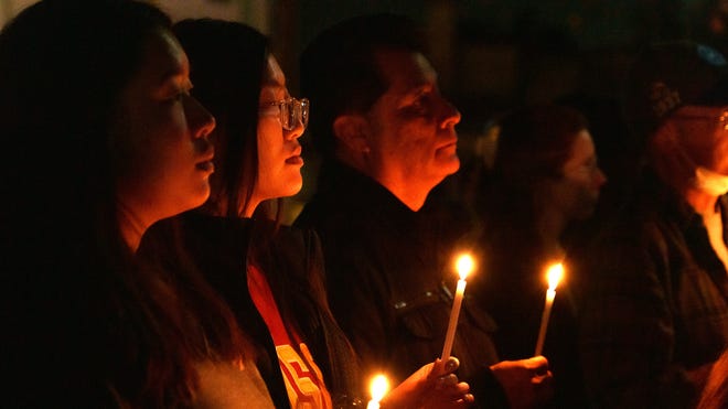 Community members gathered Monday night near the Monterey Park City Hall for a candlelight vigil in memory of the 11 shooting victims.